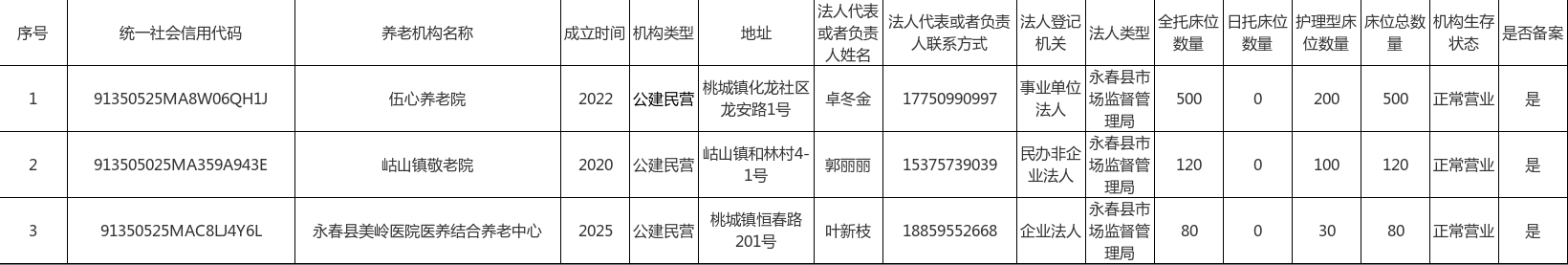 永春縣2025年養老機構備案信息